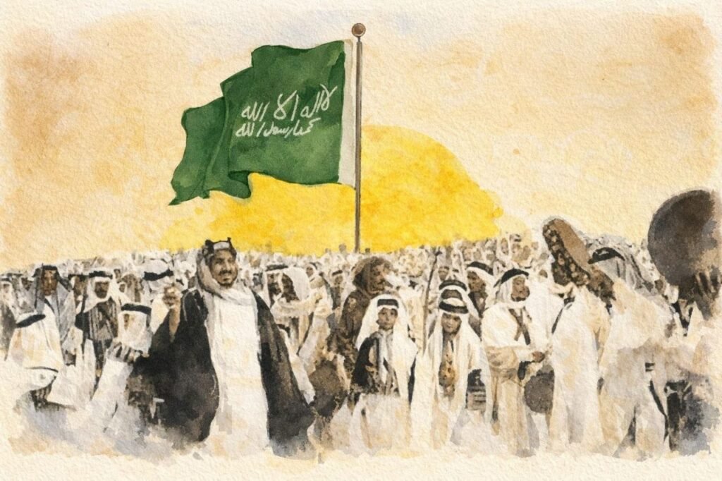 المؤسس الملك عبد العزيز رحمه الله شرع مسيرة توحيد وطننا، وعلم المملكة الأخضر يعكس عقيدتنا، والتوحيد رمز إيماننا، بينما السيف يدل على القوة والعدل